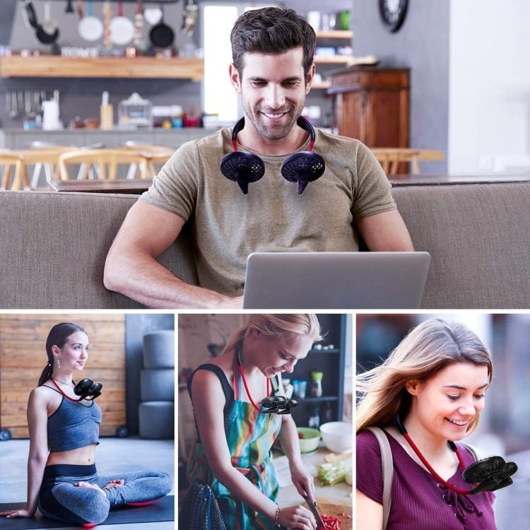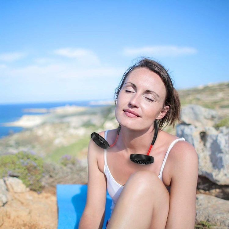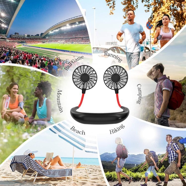 - Hand Free ? HIPTAGE portable sports neck fan is designed as a headphone to free your hands anywhere. The fashion style makes you look so cool. When it sits around your neck, the lightweight comfort and flexibility design will keep you cool and relaxed when you’re outdoors, relaxing at the beach, or reading in bed with quiet support.