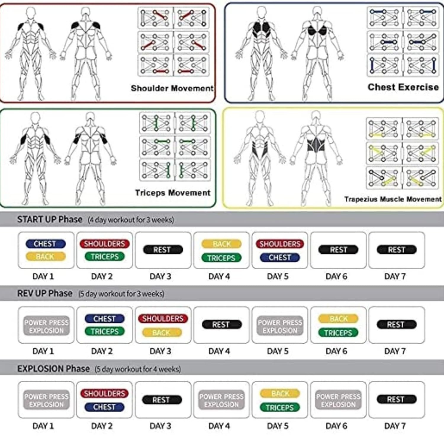 • Our E- Book contains diferent ways to use push-up board for different muscle groups.