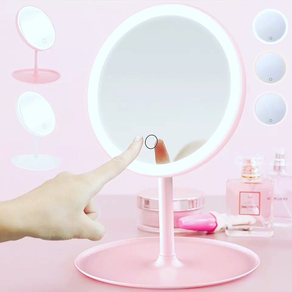 A multifunctional beauty accessory combining a table lamp, makeup mirror, and storage tray. Designed with adjustable LED lighting, a rotatable mirror surface, and a sleek modern base—perfect for grooming, studying, or adding style to your vanity or desk.
