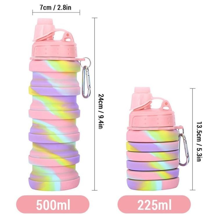 - ?With its foldable design, our collapsible water bottle reduces in volume by 50% after folding, making it compact and easy to carry wherever you go. It comes with an aluminum alloy safety clasp that can be attached to your backpack, making it perfect for gyms, workouts, offices, and outdoor activities.