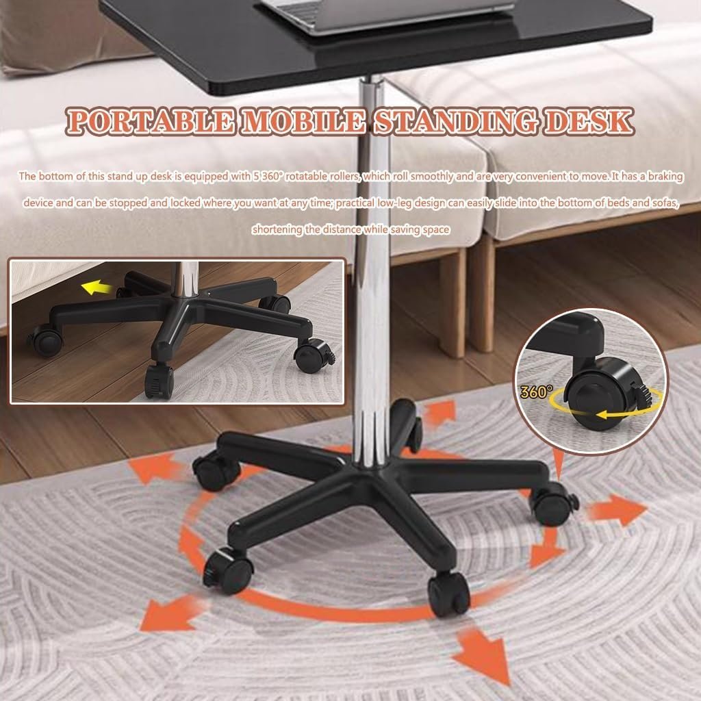 • ??Portable mobile standing desk?: The bottom of this stand up desk is equipped with 5 360? rotatable rollers, which roll smoothly and are very convenient to move. It has a braking device and can be stopped and locked where you want at any time; practical The low-leg design can easily slide into the bottom of beds and sofas, shortening the distance while saving space.