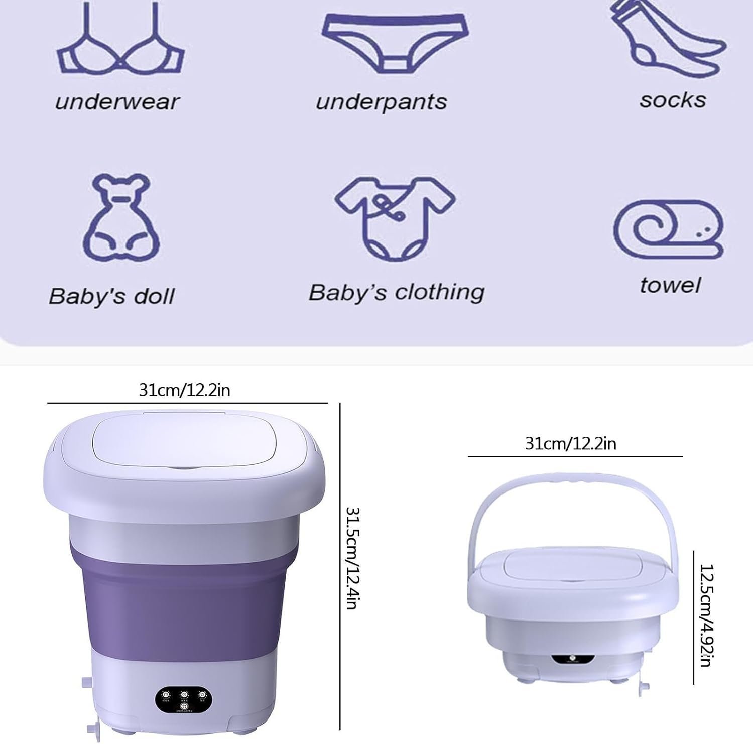 • ?Practical and portable: discover more possibilities and take your mini washing machine with you wherever you go. The foldable design and portable handle allow for easy storage in apartments and dormitories. Size: 12.2 x 12.2 x 4.92 inches after folding.