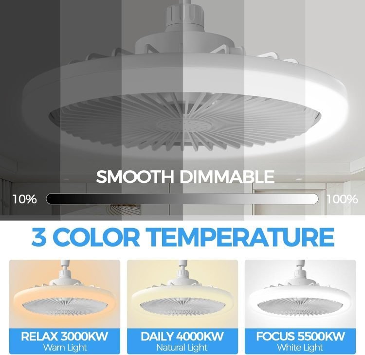 - ?Socket Fan Light with Remote – Biukis Ceiling fan with light with 3 speeds and timer function (1/2/4 hour option). Ceiling fan light is infinitely adjustable with three color temperatures (3000K-6500K): White/Neutral/Warm. You can adjust the lighting from dim to bright and switch to the most comfortable mode according to your personal preference. The ceiling fan has a memory function that will your lighting settings.