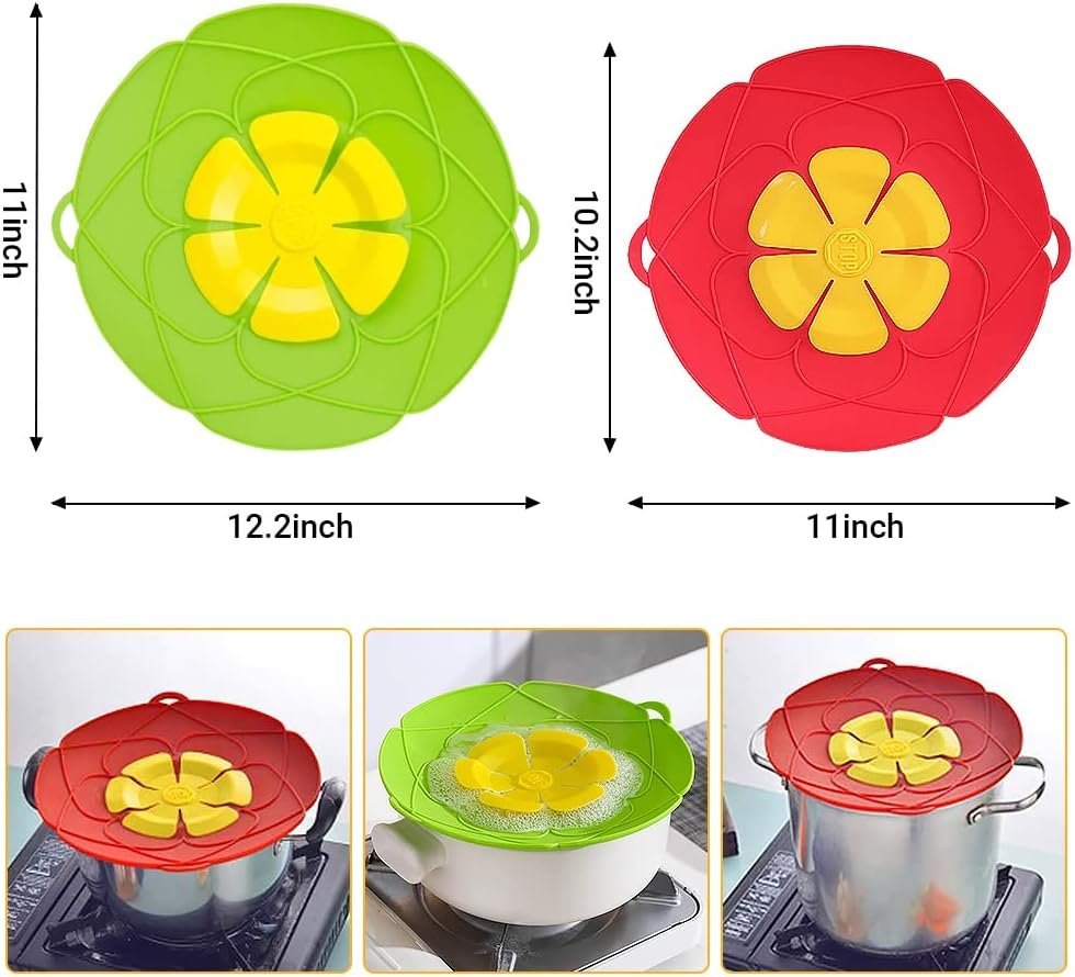 - 🍲Splatter Guard – The anti-overflow spill lid is suitable for most pots and pans. The silicone lid has a steam release port and a silicone handle for easy grip and is specially thoughtfully designed to prevent accidental burns.