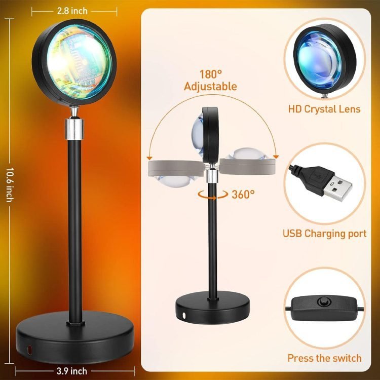 - HD Crystal Lens:The sunset projector has an HD Thickened crystal lens. strong light transmission and refraction wider light-emitting surface, farther distance, and larger sunset light projector range. Make more beautiful night lights effect. Energy-saving and life span with top-quality LEDs. Great ideal for atmosphere decoration.Let all the rainbow light gather on you.