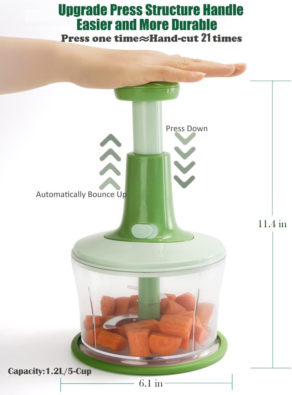 - CREATIVE PUSH TYPE DESIGN – Manually press structure handle, easier to press up and down, you can control the strength and speed freely according to needs. PRESS 1 TIME?HAND CUT 21 TIMES, making meat, veggies, fruits, herbs chopping quickly with a few pushes. 5-cup capacity, which can process a lot of food in one go, saving your time.