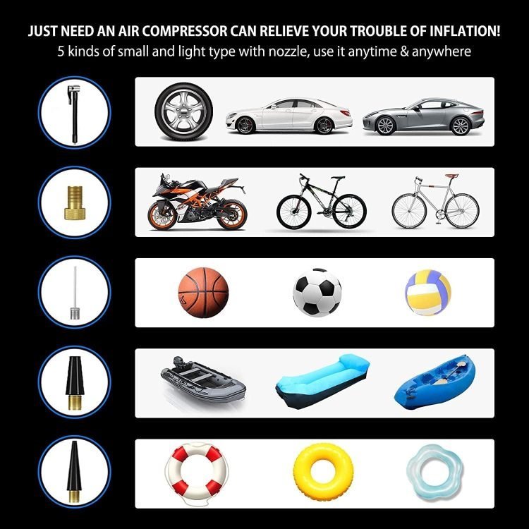 • Multiple Accessories: Our tire pumps come with a wide range of accessories, including 3.5M long power cord, ball needle, bike needle, long air nozzle, short air nozzle, fuse, and cloth bag to ensure you can use it in a variety of applications without worr