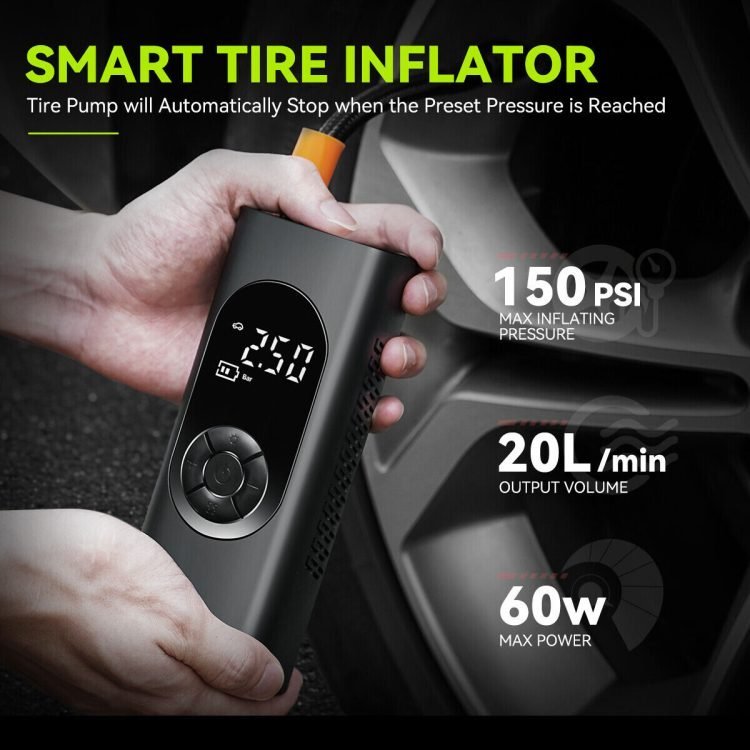 Tire Inflator, Portable Air Compressor for Car Tire, LCD Digital Display, Cordless Compact Bike Pump, 12V, 38L/MIN, 150PSI, LED Light, for Cars, E-bikes, Balls, Motorcycles