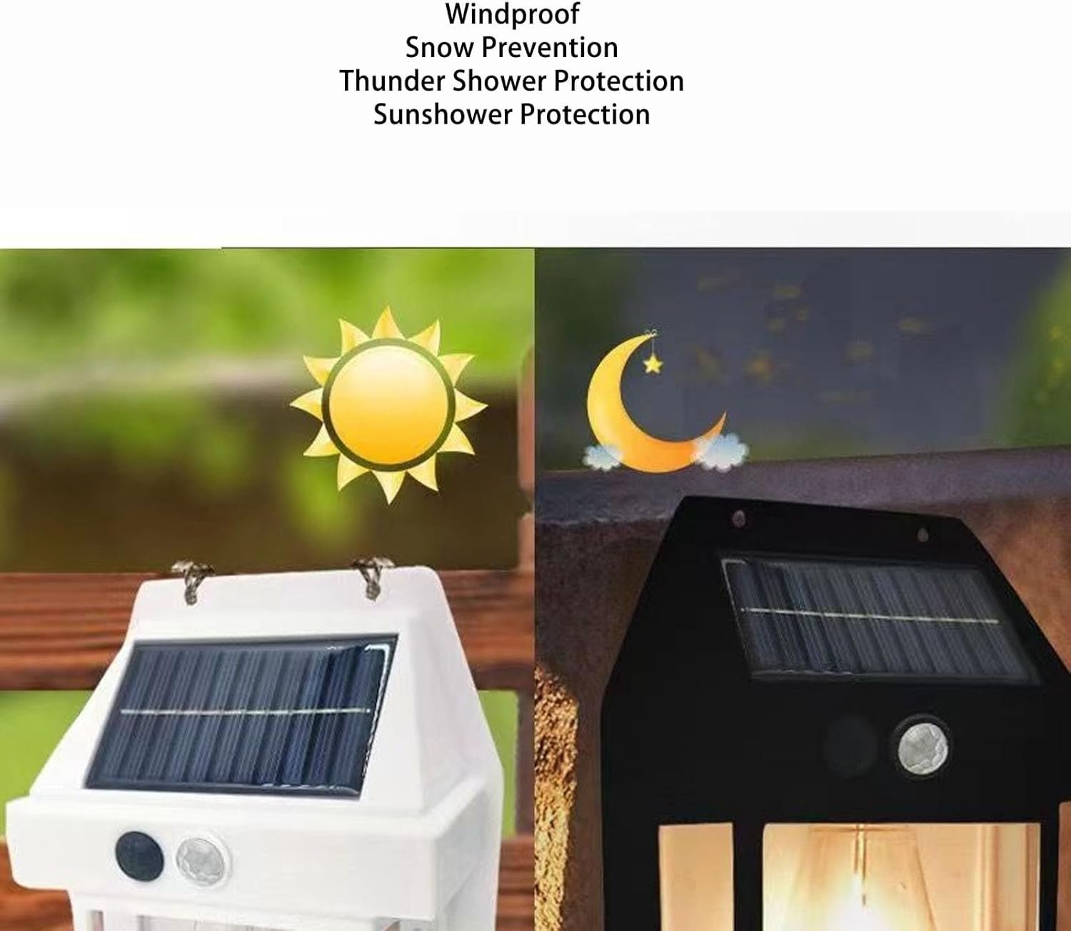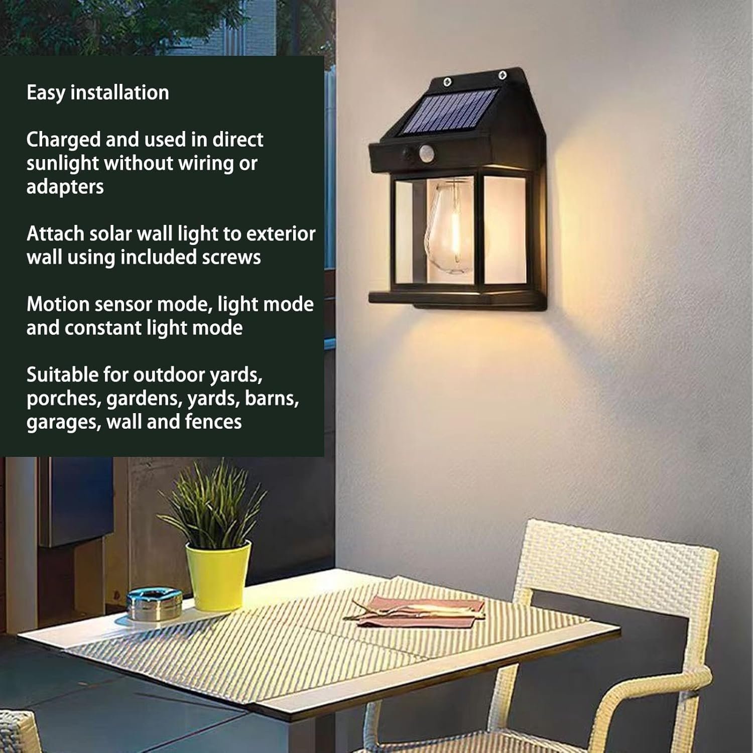 3. ENVIRONMENTAL PROTECTION AND DURABLE: Solar tungsten wire wall lamp with built in 1800 mah battery power supply, absorb sunlight during the day to charge, automatically turn on the light at night without power consumption. Charge 6‑8 hours, continuous lighting for 8 hours