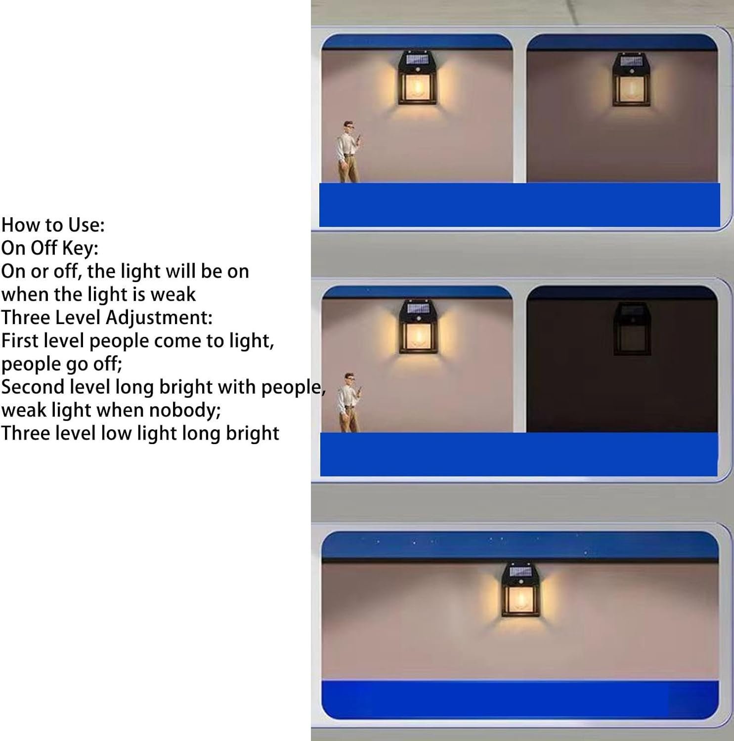 Three Level Adjustment: First level people come to light, people go off; Second level long bright with people, weak light when nobody; Three level low light long bright