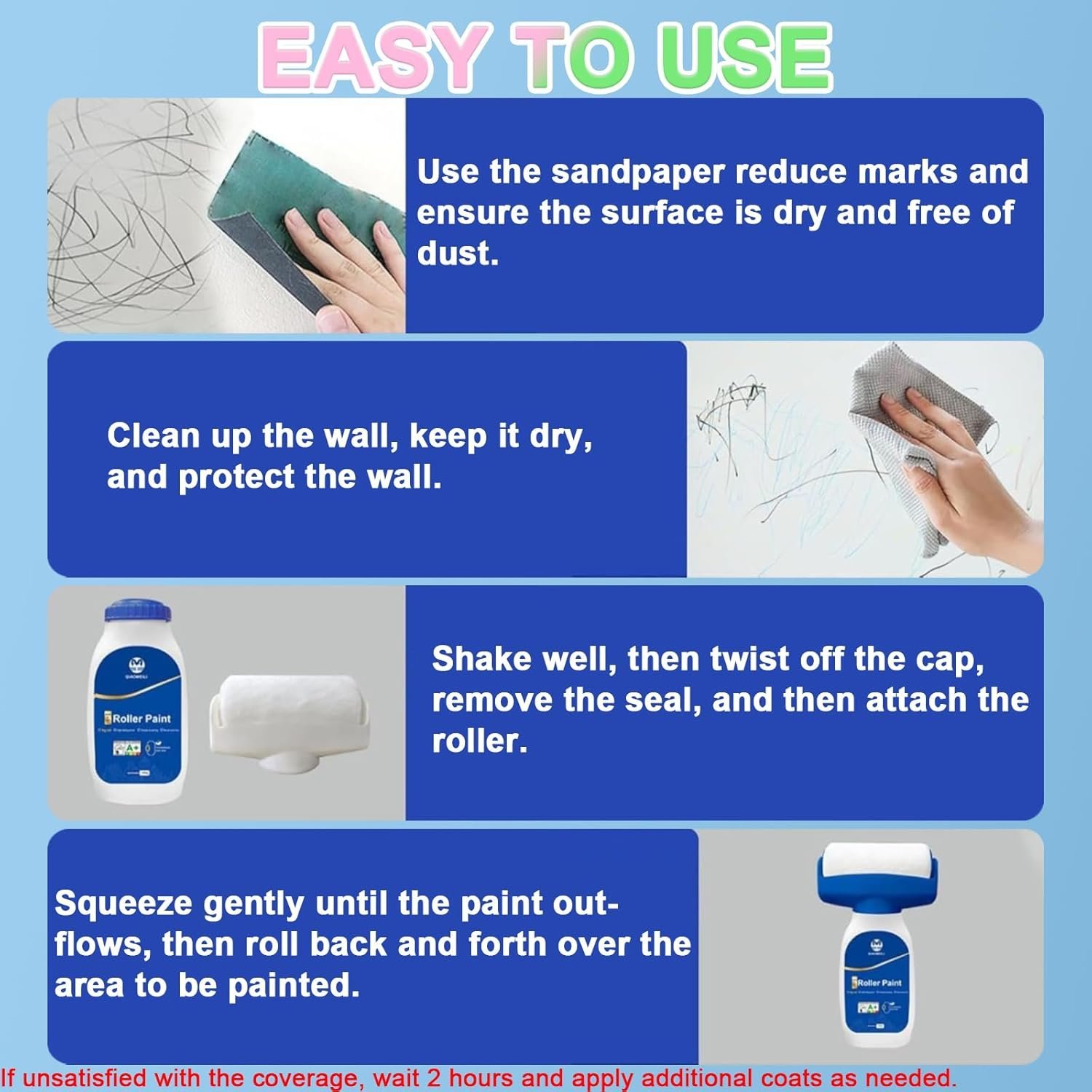 - Squeeze the bottle gently and apply evenly to the wall, rolling back and forth.