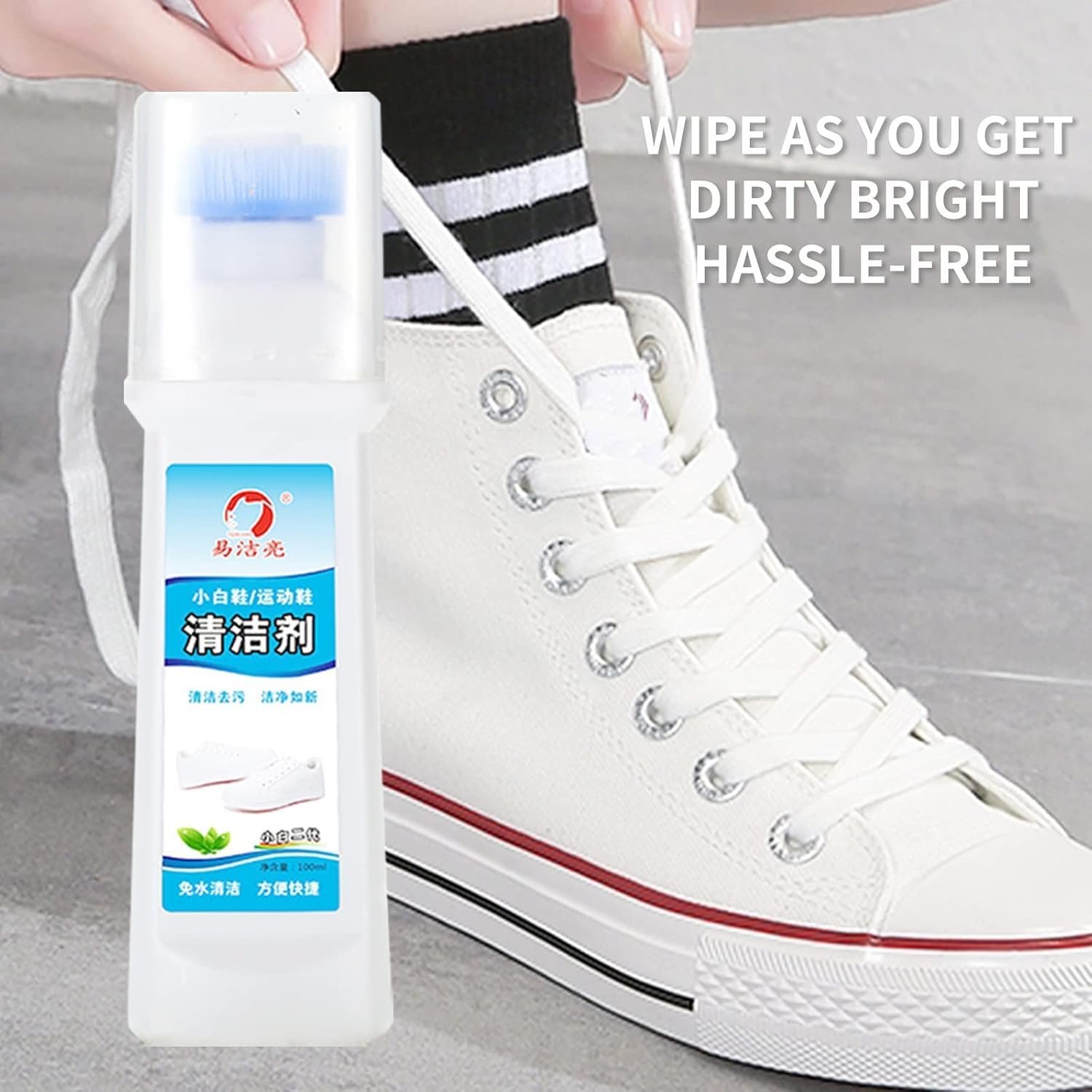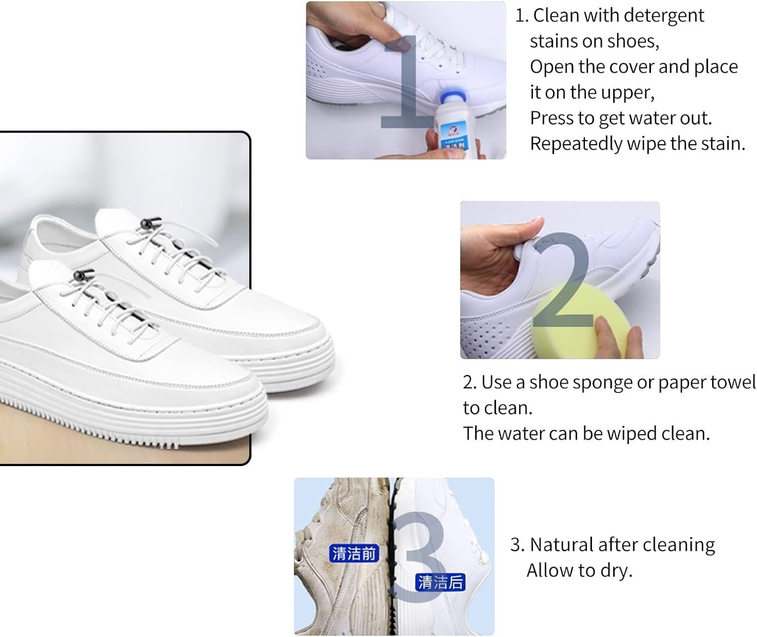 • HOW TO USE: Press the cleaner upside down on the shoe surface a few times, wait for the liquid to flow out, then use the brush head to repeatedly wipe the dirty areas on the shoe surface, repeat the use several times, and clean dry the shoe surface.